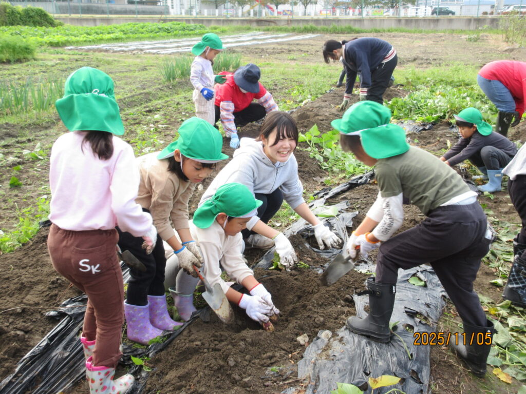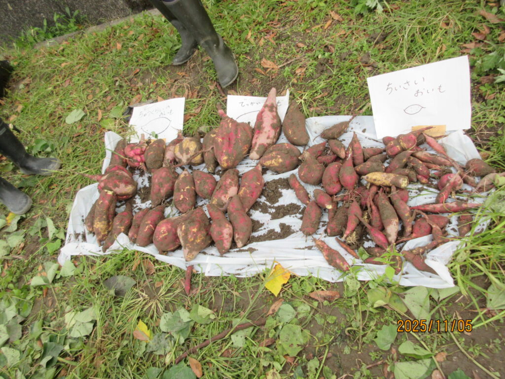 今年は富山国際大学の学生さんも手伝いに来てくれて、畑いっぱいに伸びたツルをみんなで協力して力いっぱい引っ張りました。たくさんのおいもが掘れて、子ども達も大喜びでした!