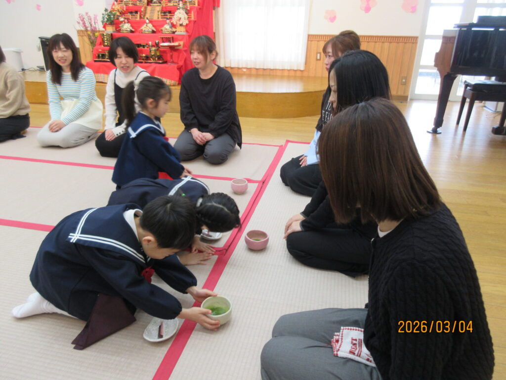 4月から始まった”お茶のおけいこ”のお作法を思い出しながら、おうちの方にお茶を点てたり、お運びしたりしました。少し緊張しながらも、おうちの方に『おいしかったよ』と声を掛けられると、にっこり嬉しそうに微笑んでいました。